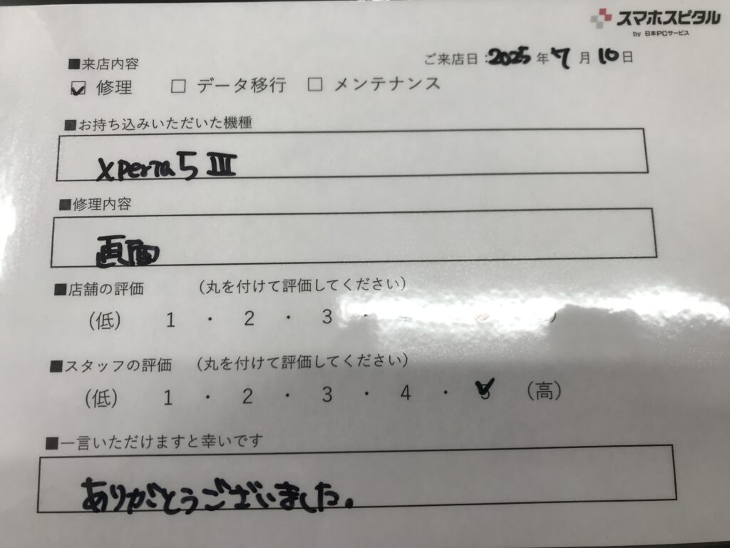 スマホスピタル 大阪梅田 【お客様の声】尼崎市よりお越しのお客様Xperia5Ⅲ画面交換修理をさせていただきました。
