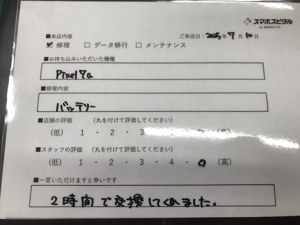 スマホスピタル 大阪梅田 【お客様の声】京橋市よりお越しのお客様Pixel7aバッテリー交換修理をさせて頂きました。