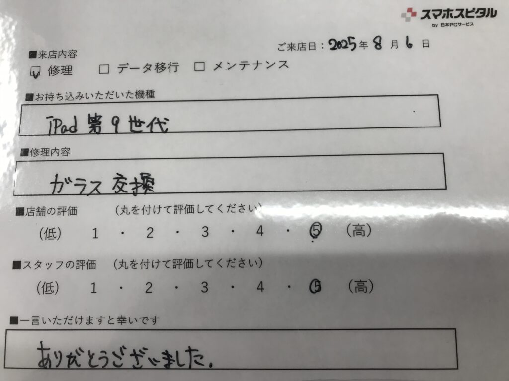 スマホスピタル 大阪梅田 【お客様の声】吹田市よりお越しのお客様iPad第9世代ガラス交換修理をさせていただきました。