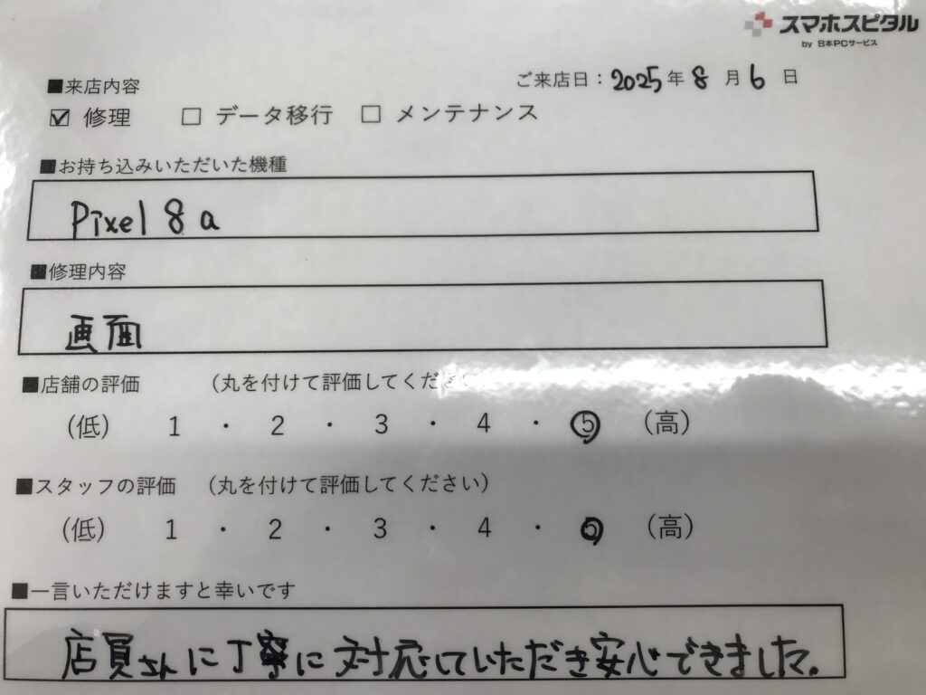 スマホスピタル 大阪梅田 【お客様の声】京橋市よりお越しのお客様Pixel8a画面交換修理をさせていただきました。