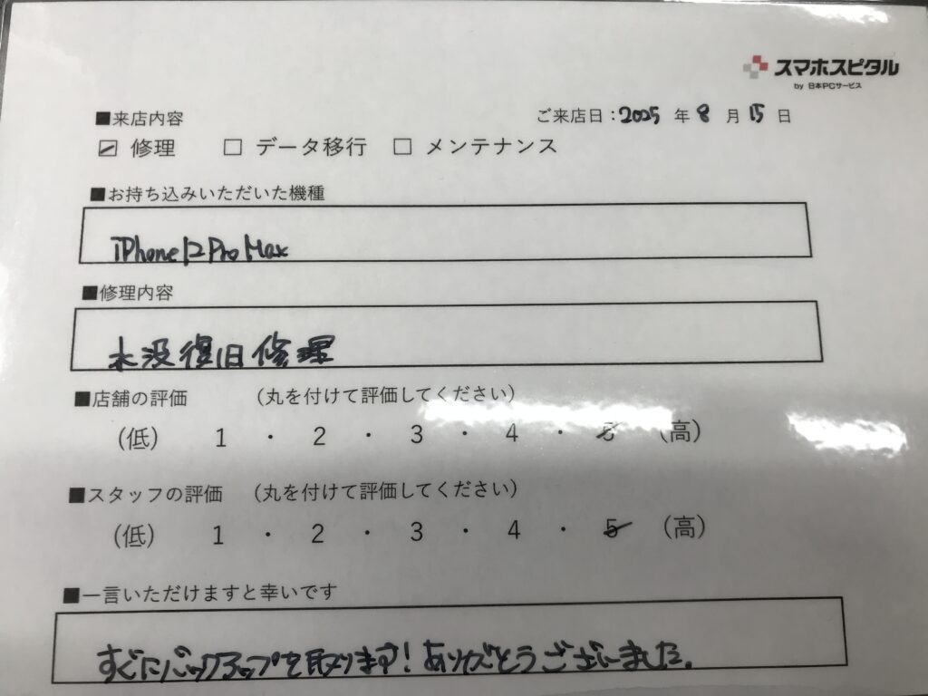 スマホスピタル 大阪梅田 【お客様の声】京橋市よりお越しのお客様iPhone12ProMax水没復旧作業をさせていただきました。