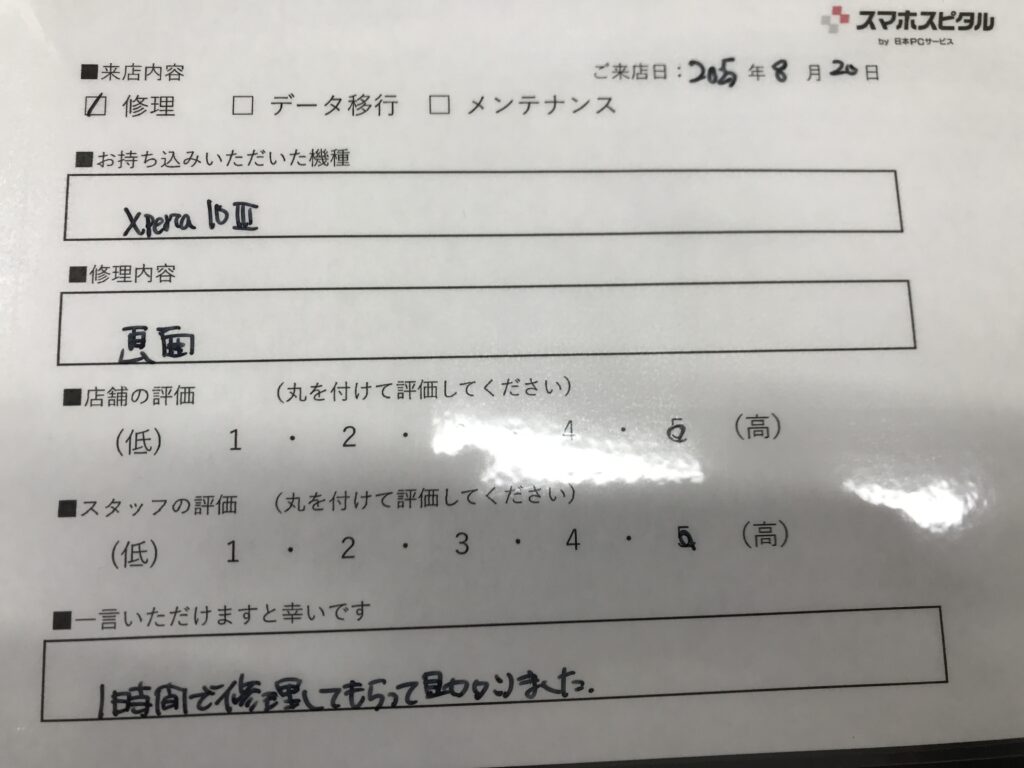 スマホスピタル 大阪梅田 【お客様の声】大阪市よりお越しのお客様Xperia10Ⅲ画面交換修理をさせていただきました。
