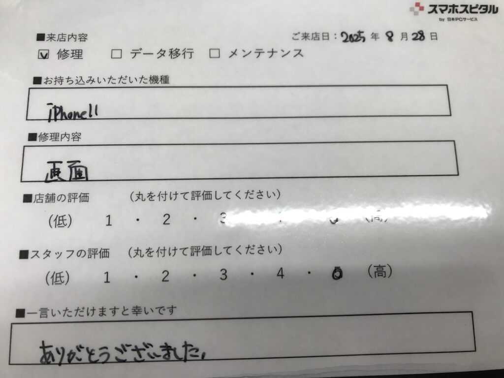スマホスピタル 大阪梅田 【お客様の声】大阪市よりお越しのお客様iPhone11画面割れ修理をさせていただきました。