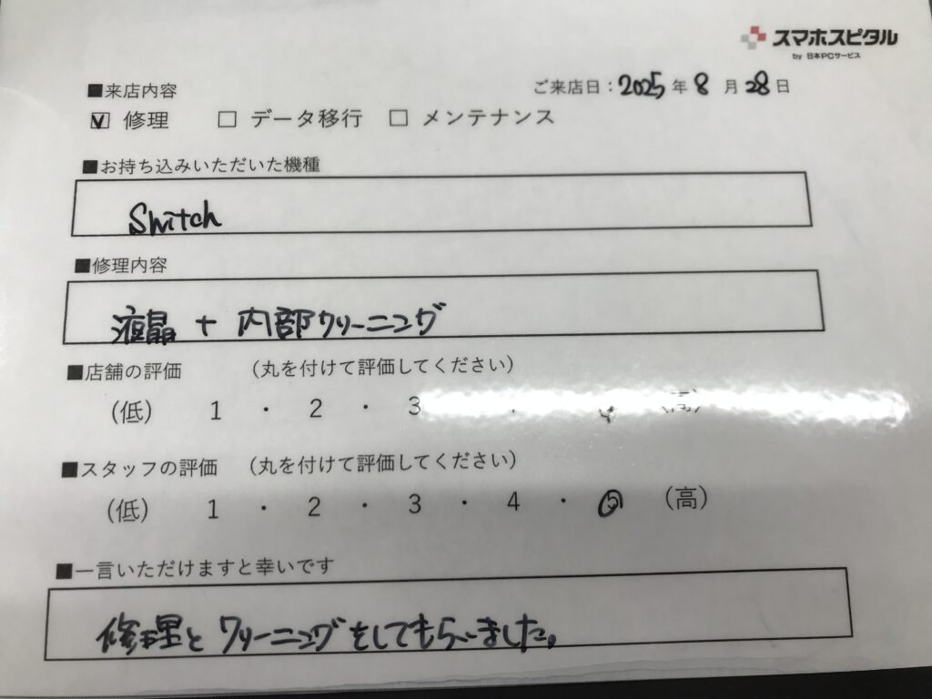 スマホスピタル 大阪梅田 【お客様の声】吹田市よりお越しのお客様Switchの液晶交換と内部クリーニングをさせていただきました。