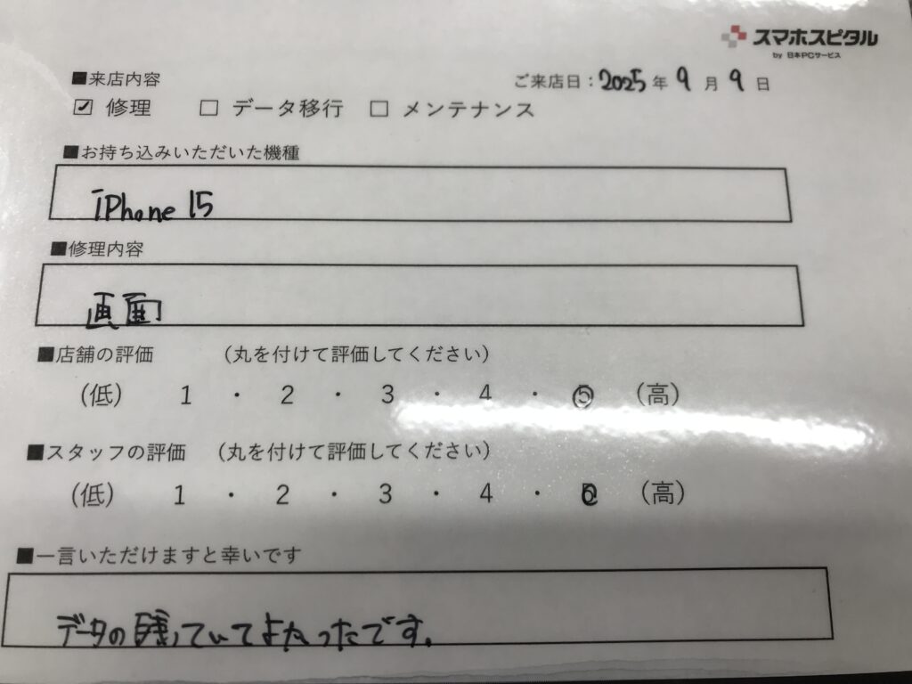 スマホスピタル 大阪梅田 【お客様の声】吹田市よりお越しのお客様iPhone15画面交換修理をさせていただきました。