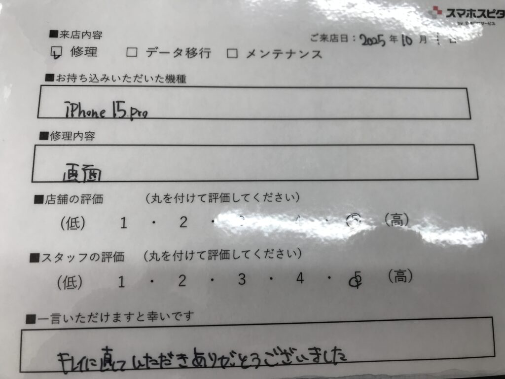 スマホスピタル 大阪梅田 【お客様の声】大阪市よりお越しのお客様iPhone15Pro画面交換修理をさせていただきました。