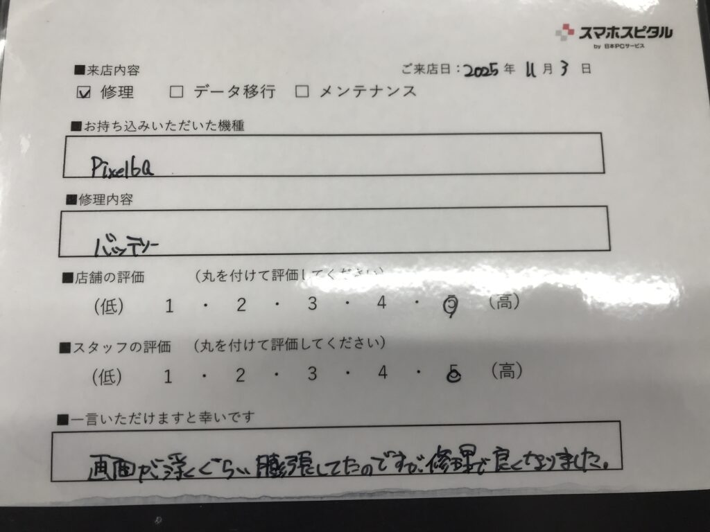 スマホスピタル 大阪梅田 【お客様の声】東大阪市よりお越しのお客様Pixel6aバッテリー交換修理をさせていただきました。