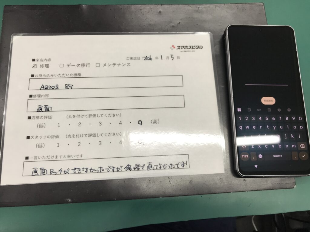 スマホスピタル 大阪梅田 【お客様の声】豊中市よりお越しのお客様AQUOS R7画面交換修理をさせていただきました。