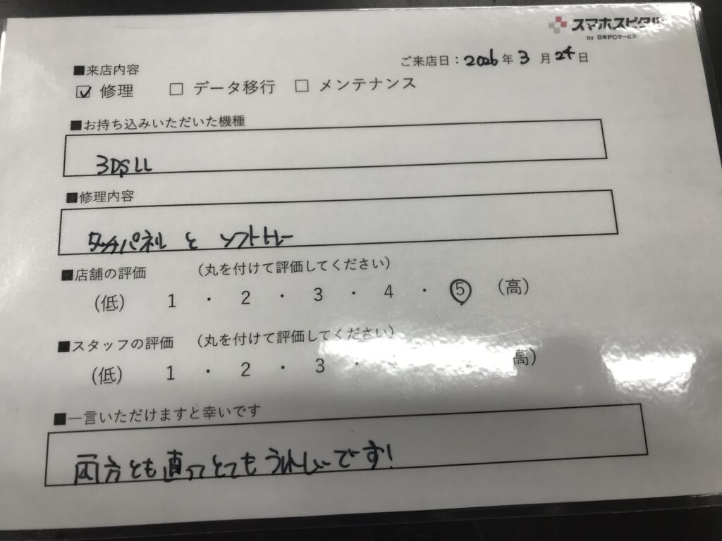 スマホスピタル 大阪梅田 【お客様の声】西宮市よりお越しのお客様3DSLLの修理をさせていただきました。