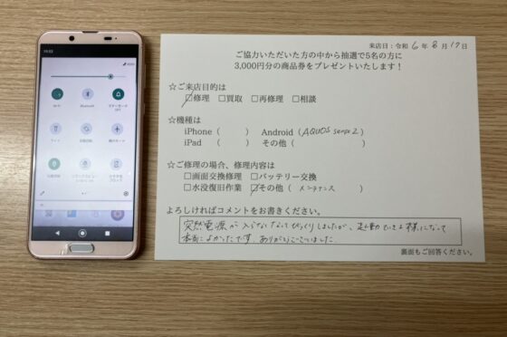 【お客様の声】大阪市よりお越しのお客様のAQUOS sense 2のメンテナンス作業をしました!