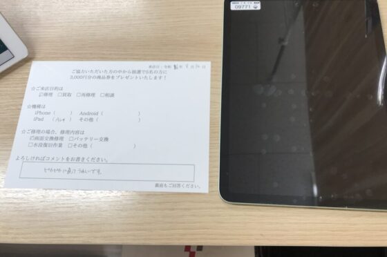 【お客様の声】大阪市よりお越しのお客様iPadAir4画面交換修理をさせて頂きました。