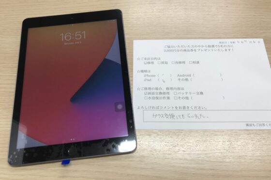 【お客様の声】大阪市からお越しのお客様iPad6ガラス交換修理させて頂きました。
