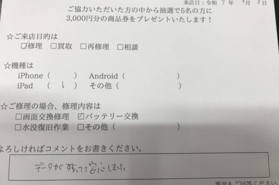 【お客様の声】吹田市よりお越しのお客様iPad6バッテリー交換修理をさせて頂きました。