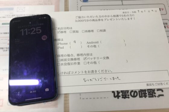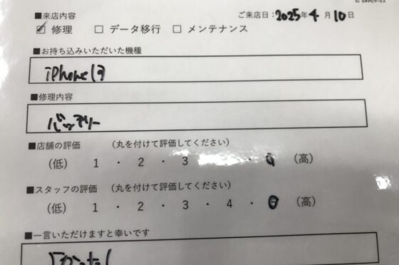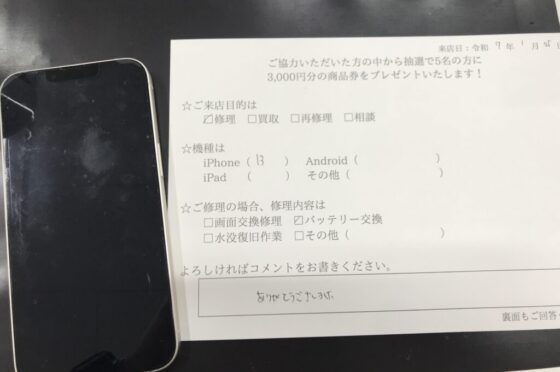 【お客様の声】東大阪市よりお越しのお客様iPhone13バッテリー交換修理させて頂きました。