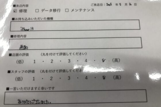 【お客様の声】尼崎市よりお越しのお客様iPhone13画面交換修理をさせて頂きました。