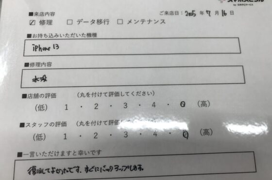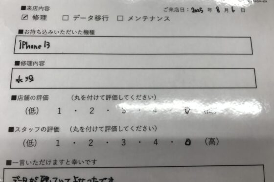 【お客様の声】尼崎市よりお越しのお客様iPhone13水没復旧修理をさせていただきました。
