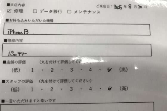 【お客様の声】京橋市よりお越しのお客様iPhone13バッテリー交換修理をさせていただきました。