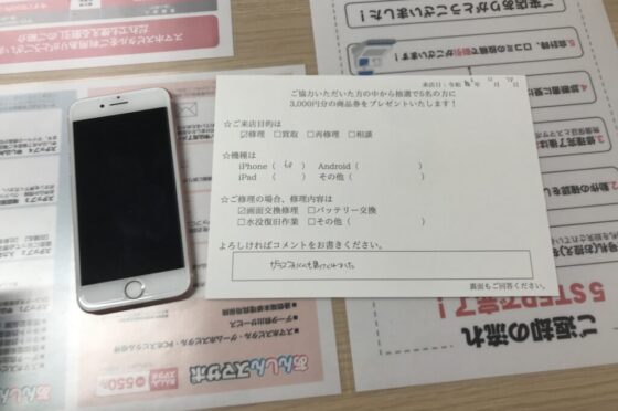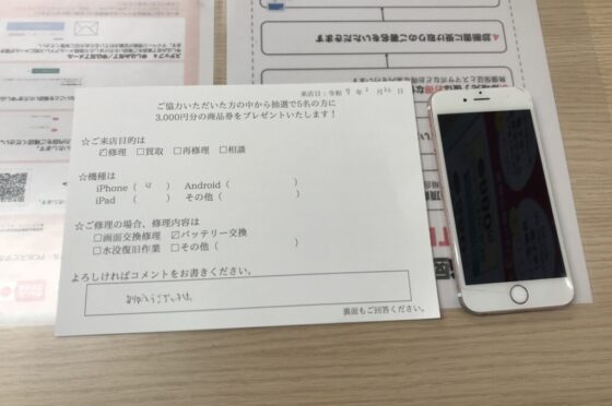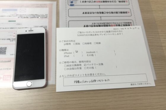 【お客様の声】東大阪市よりお越しのお客様iPhone6sバッテリー交換修理させて頂きました。