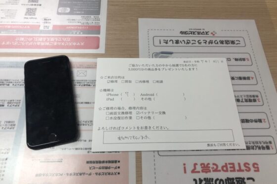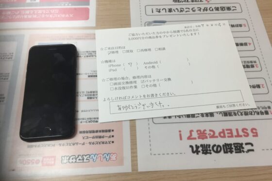 【お客様の声】東大阪市よりお越しのお客様iPhone7バッテリー交換修理をさせて頂きました。