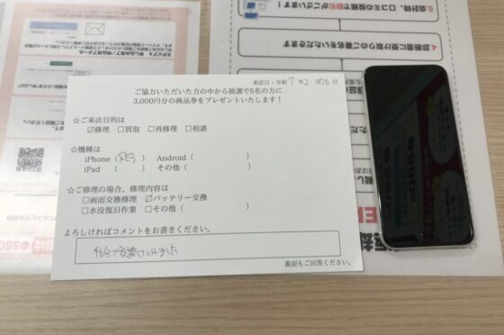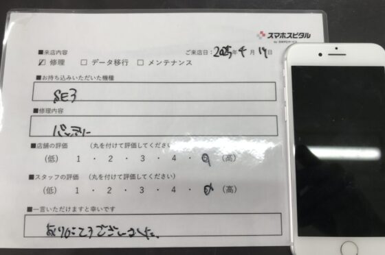 【お客様の声】東大阪市よりお越しのお客様iPhoneSE3バッテリー交換修理をさせて頂きました。