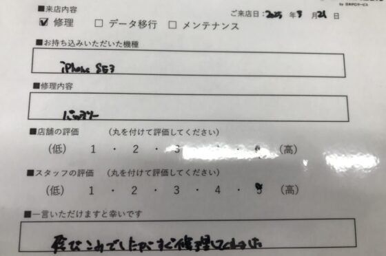 【お客様の声】大阪市よりお越しのお客様iPhoneSE3バッテリー交換修理をさせて頂きました。