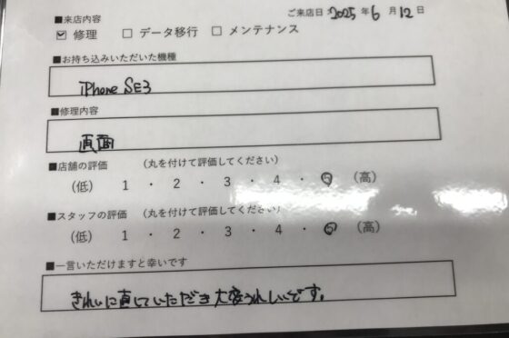 【お客様の声】大阪市よりお越しのお客様iPhoneSE3画面交換修理させて頂きました。