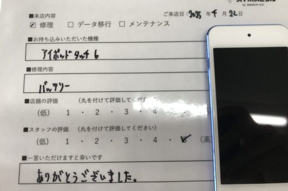 【お客様の声】大阪市よりお越しのお客様iPodtouch6バッテリー交換修理をさせて頂きました。
