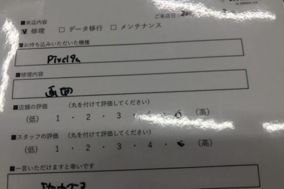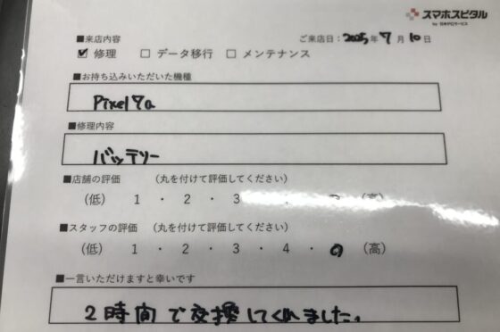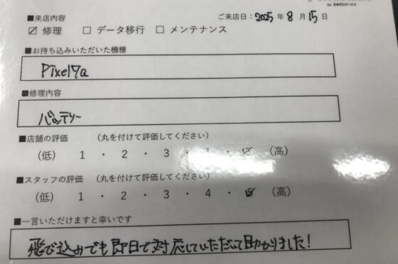【お客様の声】西宮市よりお越しのお客様Pixel7aバッテリー交換をさせて頂きました。