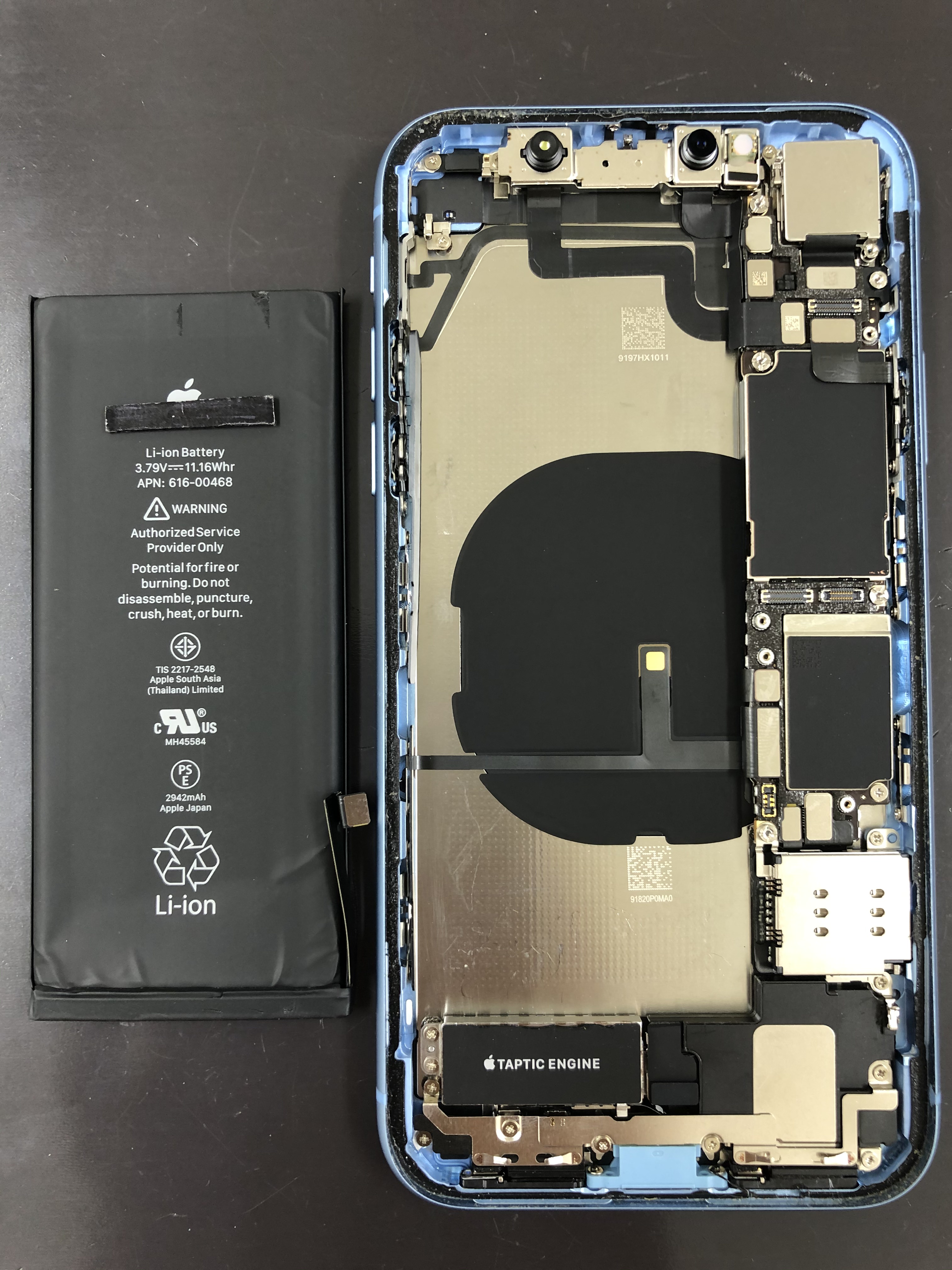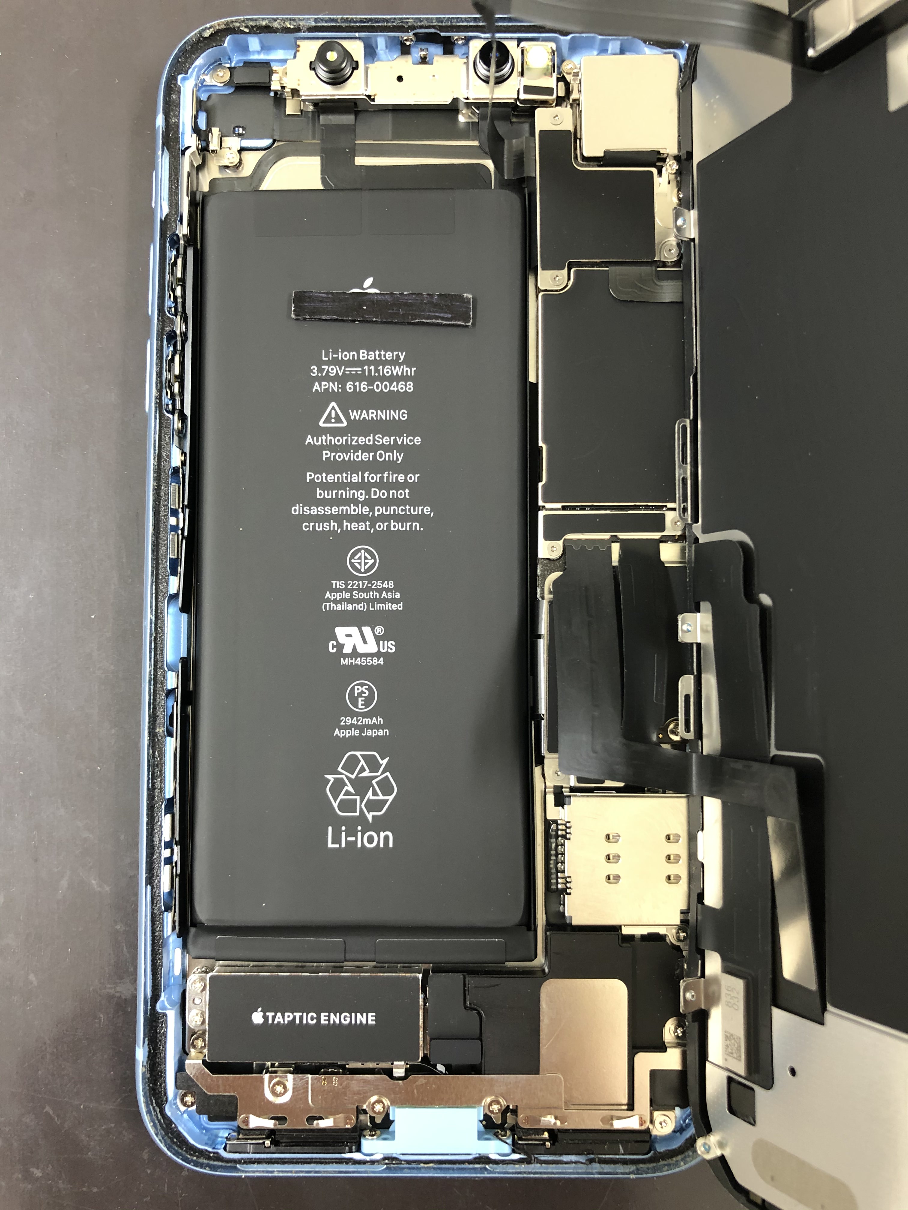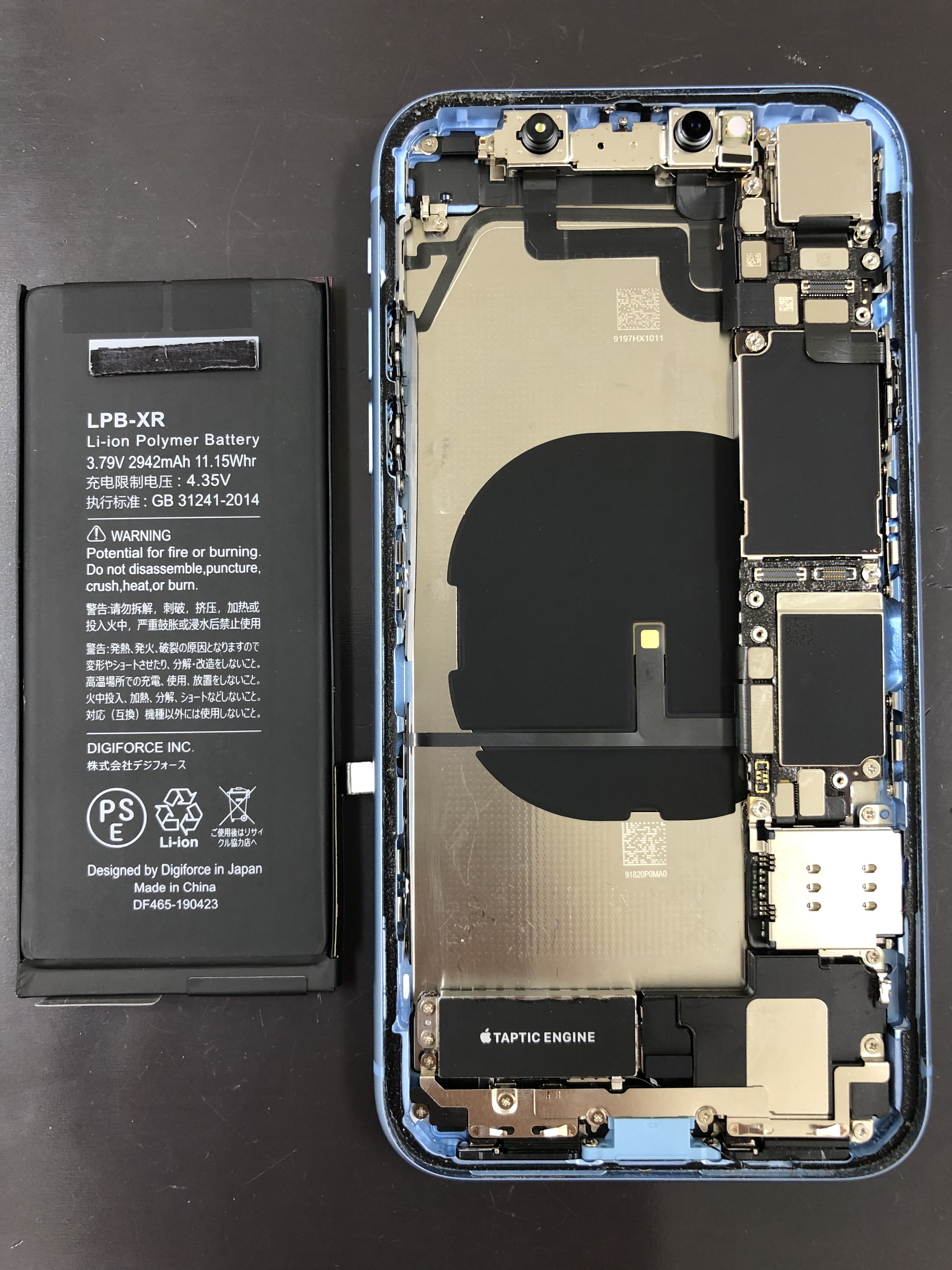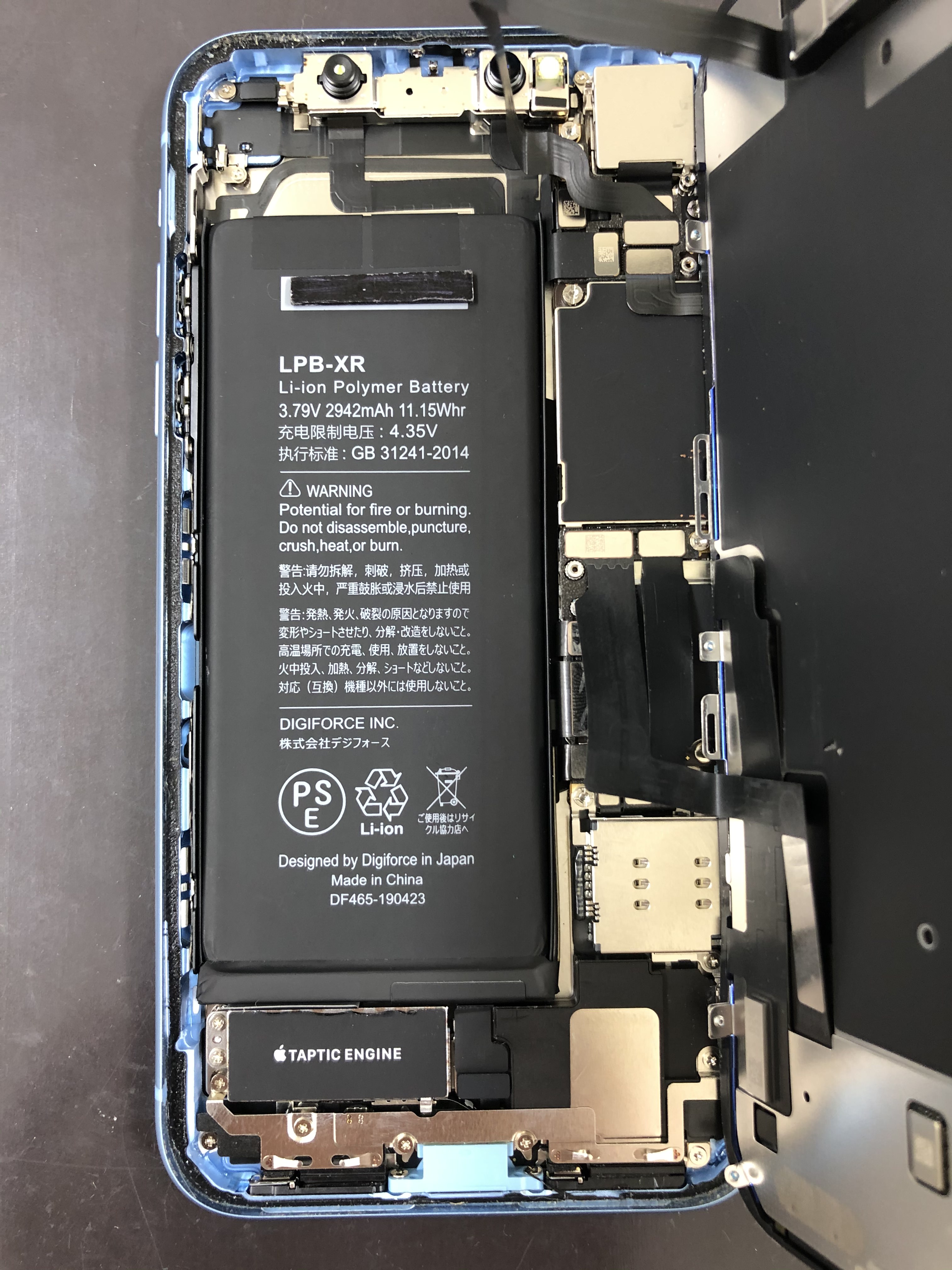 元のバッテリーになります。iPhoneXRの中はこんな感じ♪