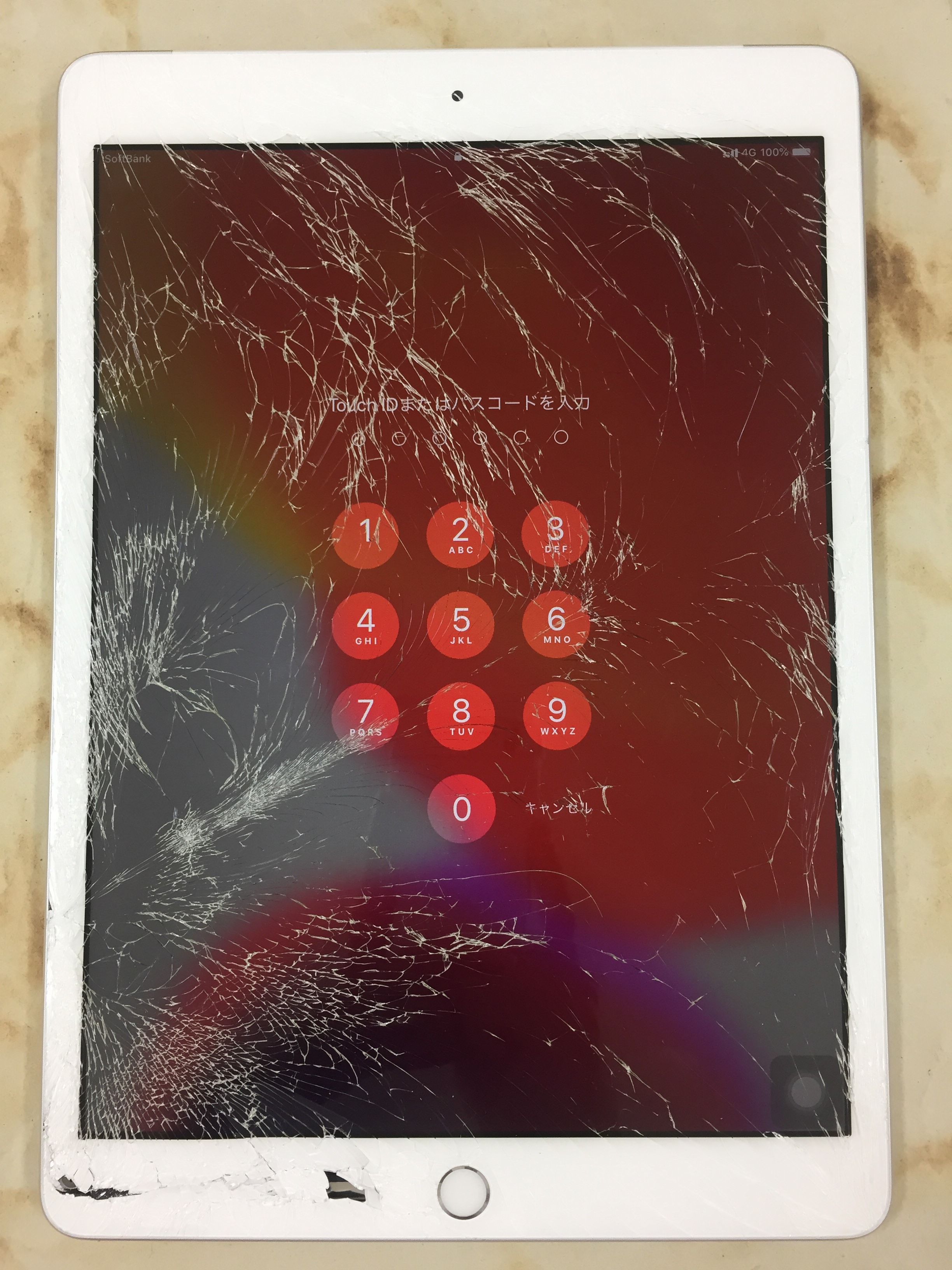 今回、鹿沼市内よりiPad7をお持ち頂いたお客様は、ご自宅のフローリングに落としてフロントガラスが全体的に割れてしまったとのことでした。iPadの場合はiPhoneと比べると大きな本体と画面ですので、重さによって大きな衝撃が広く伝わってしまうようですね。ホームボタン付近はガラスが剥がれ内部が見えている状態になっており、そのまま放っておくと本体内部の故障の原因にもなりかねません。