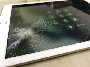 こちらはiPad5を落としてしまい写真のように画面にひび割れが広がってしまった!このような症状は画面交換を行うことでキレイに修理が可能です。iPad系は落としてしまうとその重量から画面割れリスクが高くなってしまいます。また、iPadを踏みつけてしまうことで破損してしまうこともありますので屋内で使用する際にも十分の注意が必要ですね。