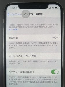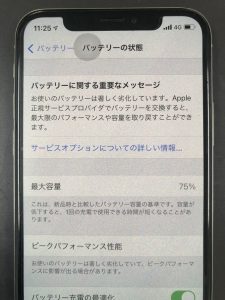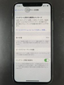 こちらはiPhoneXのバッテリー持ちが悪くなってきた。とのことでご相談頂きお持込み頂きました。下記写真の様に最大容量が75%にまで劣化しております。80%台まで減っていたらバッテリー交換時期ですので早めにバッテリー交換を行っておくと安心ですね。