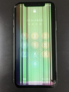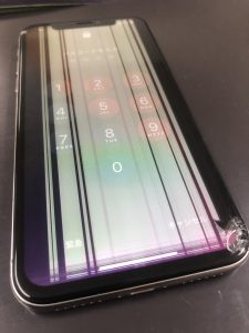 こちらはさくら市よりiPhoneXを落としたら画面に縦線がたくさん・・・。とご相談頂きお持込み頂きました。iPhoneXの液晶破損の症状で多くみられる症状です。このような画面になってしまったら画面交換にて改善致します。