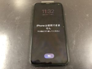 今回はiPhoneXSの画面が真っ暗な症状でしたが画面交換を行うことで写真の様に映るようになりました。しかし「iPhoneは使用できません」という状態になっています。これは何度かパスコードを間違うと出る画面になります。11回パスコードを間違えると表示が変わり初期化しないと使えなくなります。その状態になる前に修理を完了させたいですね。そうすれば初期化リスク軽減になります♪今回は11分後に再度パスコードを正しく入れなおすことで無事起動致しました♪早めの修理はスマホスピタル宇都宮店までお気軽にお問合せ下さい♬