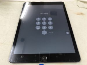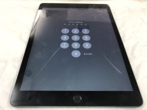 こちらは宇都宮市よりiPad8のガラスが割れてしまった!とお問合せ頂きそのままお持込みして頂きました。写真の様にガラスにヒビが入っているのが分かると思います。このようなガラス割れはガラス片などが飛び散って危ないです。なるべく早めの修理をオススメ致します。