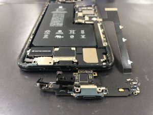 こちらは栃木市よりiPhone11ProMaxの充電が出来なくなった!とお持込み頂きました。既にバッテリーが空で動かない状態でした。不具合の切り分けを行い充電口の故障と判明した為、充電口の交換修理を行います。充電口修理は慎重に作業したい為、修理時間は余裕をもって多めに頂いております。