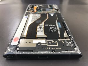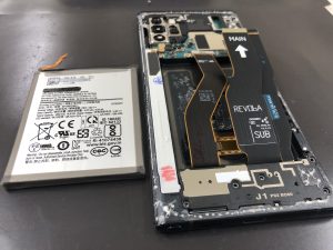 こちらはGalaxyNote10のバックパネルが浮き上がってきた・・・。とご相談頂きお持込み頂きました。Galaxy系のバックパネルが浮いてくる原因は中のバッテリー膨張が原因です。下記写真にもあるように膨張バッテリーの上を大切な配線が通っている為、放置してしまうと配線の破損により動作不可となることもあります。初期症状はバックパネルが浮いてくるのでそうなったら早めに対処しましょう。もちろん膨張したバッテリーを交換するだけなのでバッテリー交換で解決です!