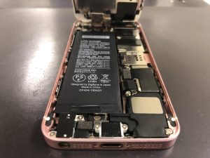 こちらは初代iPhoneSEの画面が浮いてきた!とお持込み頂きました。画面が浮いてしまう原因はバッテリーの膨張ですのでバッテリー交換を行うことで改善致します。バッテリー膨張をそのままにしてしまい画面自体が破損してしまうと画面の修理にも費用がかかってしまうために早めの交換がオススメです。
