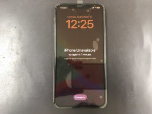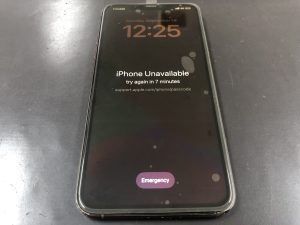 iPhone11の画面を新しいモノへ交換することで無事復活です!修理後の画面はパスコードロックの一歩手前の状態で表示時間が来るまでパスコードを打ち込めません。時間が来たらただしいパスコードを打ち込んで復活となります。