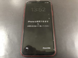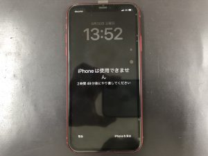 こちらは日光市よりiPhone11の画面映りが幻想的になっちゃって勝手に動き出す。とご相談頂きお持込み頂きました。写真の様にとても幻想的な画面になっておりました。この様な現象は液晶破損が原因であり、画面交換を行うことで改善致します。よく見ると「iPhoneは使えません。58分後にやりなおしてください」といった表示が・・・。もう少しでロックがかかりそうな状態でした。