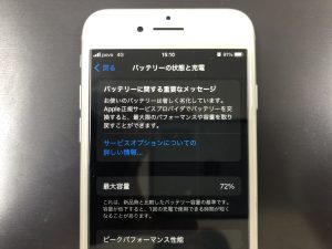こちらは宇都宮市よりiPhone8のバッテリー交換でお持込み頂きました。最大容量は写真にあるように72%でした。大体80%台まで劣化すると体感で持ちが悪く交換されるケースが多いので72%まで劣化が進んでいる例も少ないます。もちろん新品バッテリーへ交換することで最大容量100%になります♪