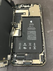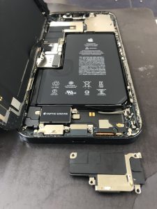 こちらはiPhone12ProMaxでYoutubeを見るときの音が聞こえなくなった。とお問合せ頂きお持込みとなりました。よく聞いてみると上の方からの音は聞こえるが下からの音が聞こえない状態でした。この様な場合はスピーカーの故障が原因ですのでスピーカー交換で改善致します。