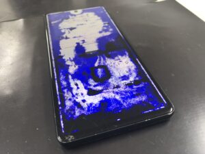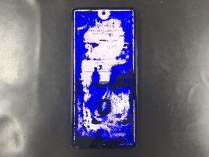 こちらは宇都宮市よりGooglePixel7を落としてしまい、拾い上げたら画面が破損して見れなくなった!とご相談頂きお持込み頂きました。写真の様に画面全体が青と白のコントラストが芸術的な画面状態となっておりました。この様な症状は内部の液晶が破損して表示異常を起こしております。新品の画面に交換することで、元通りの状態で改善致します。