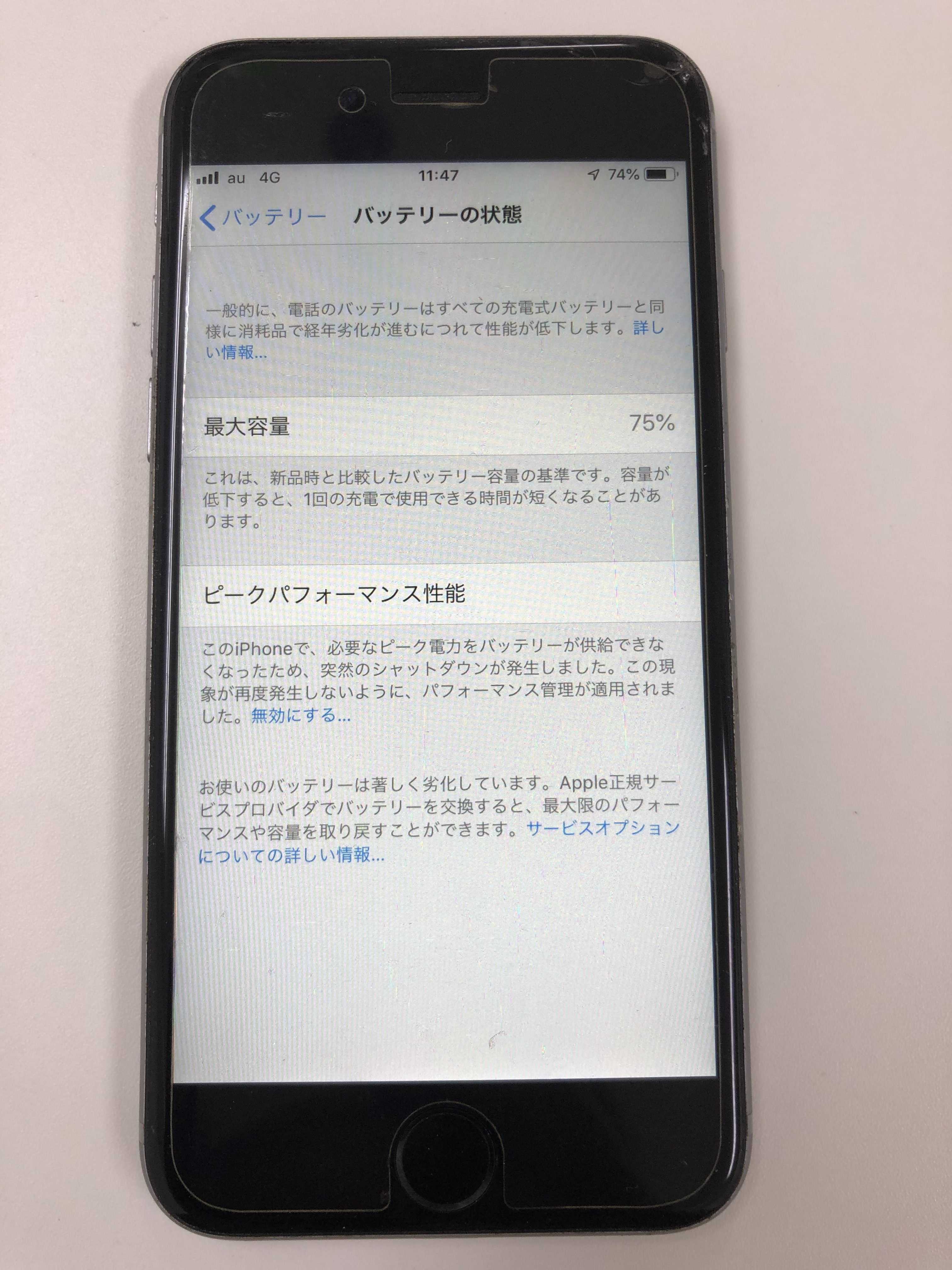 最大容量75%はかなりバッテリー劣化が進んでいますね((+_+))