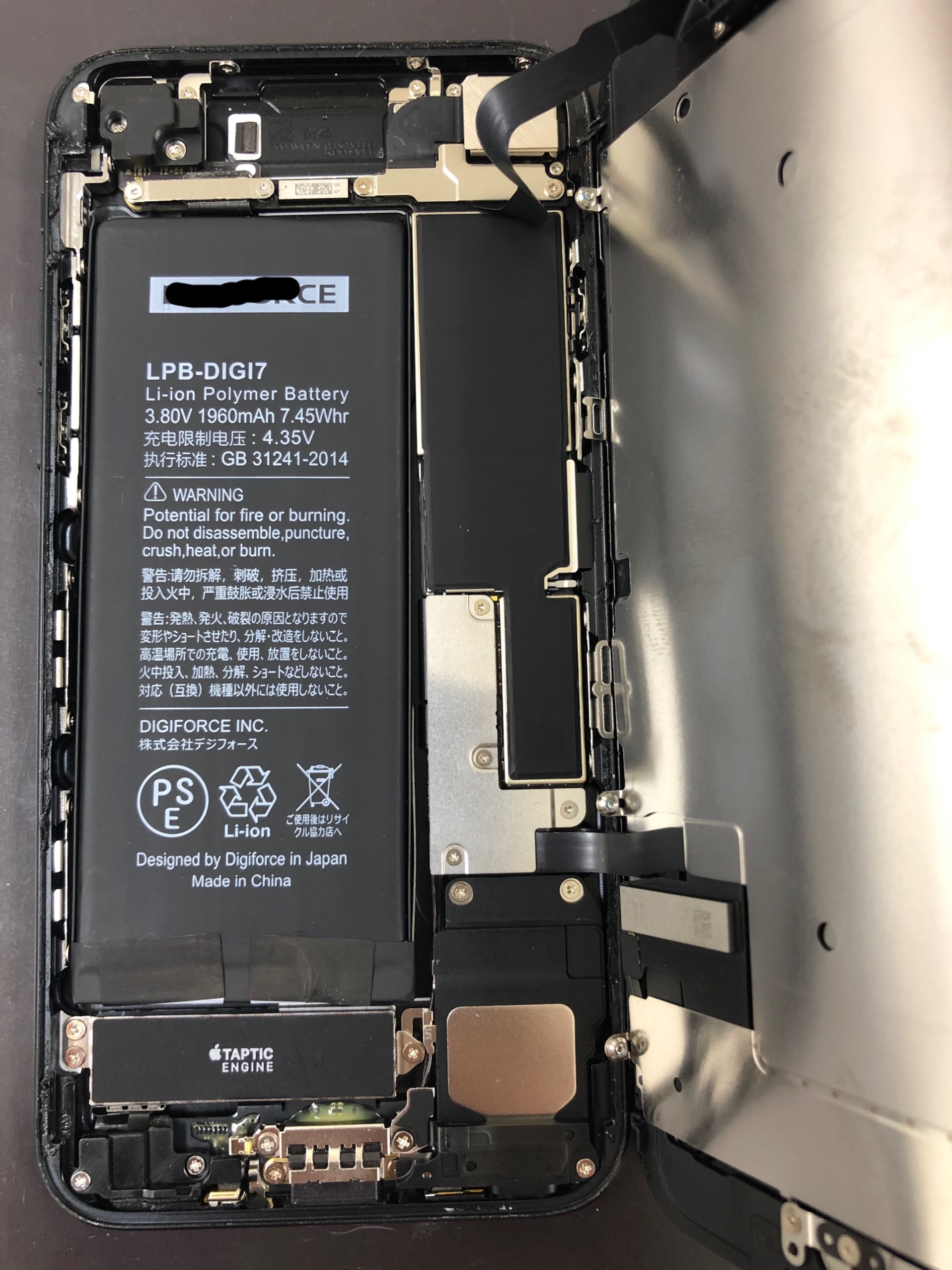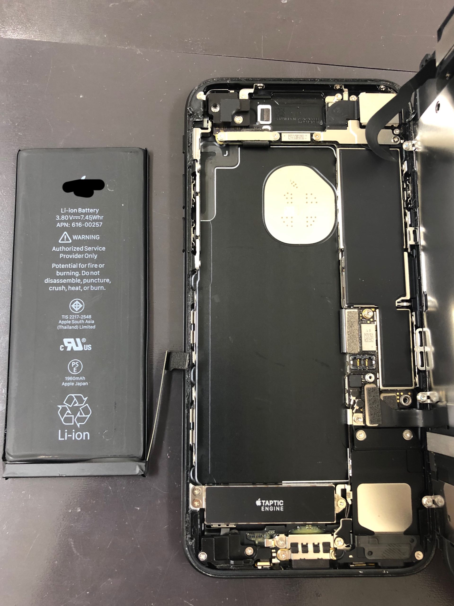 iPhone7のバッテリーの調子が悪いとお持込みいただきました!状態としては100%あった充電が20分間の移動中に気が付くと20%に減っていることがよくあるとのことでした。20分間の移動中にはiPhoneは使っていないのにも関わらず減っているということは相当バッテリーの劣化が進んでいるか基板に異常があるかのどちらになります。今回は基板周りはとても綺麗で水が浸み込んでいる形跡もありませんでしたのでバッテリー交換で改善されるでしょう!