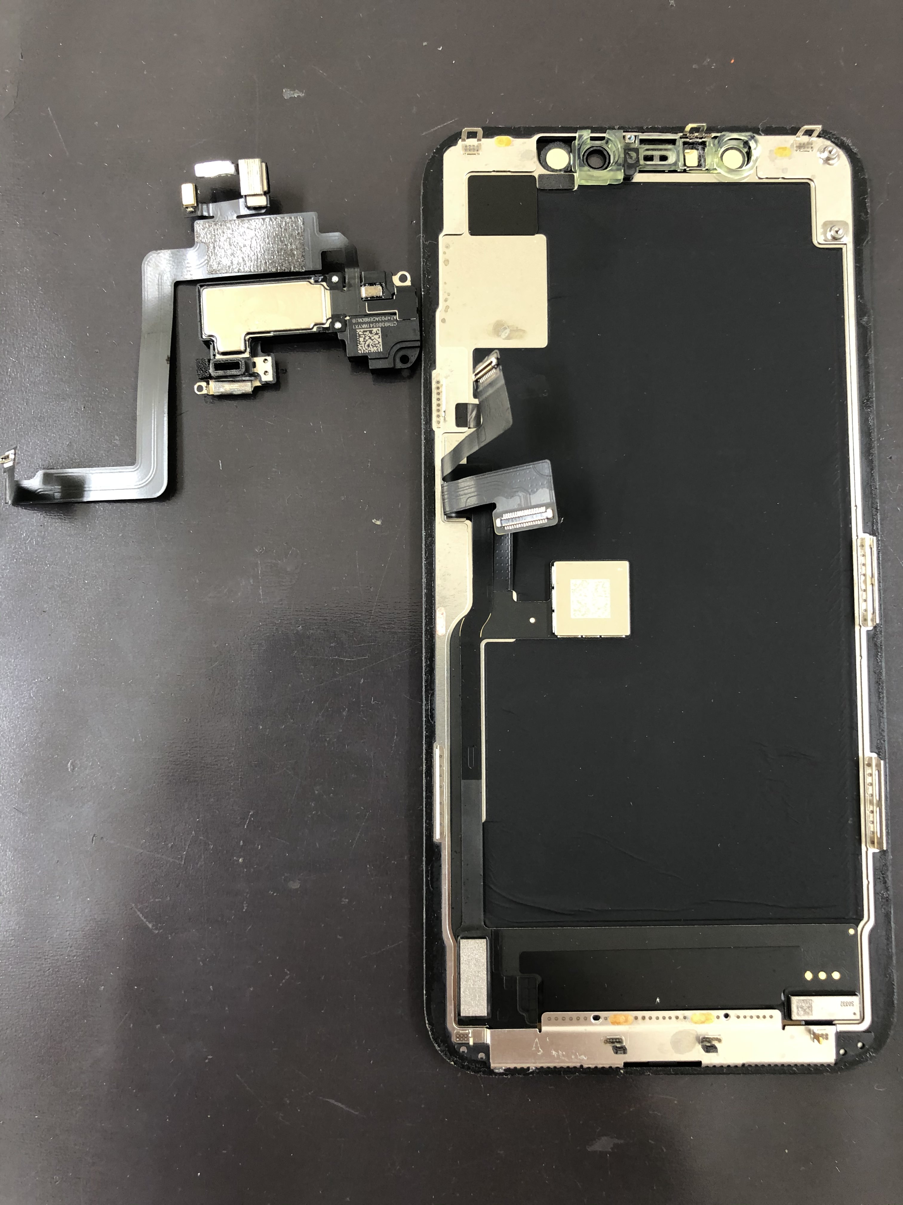 画面側のパーツも外して清掃します。Face IDが使えなくなったとのことでこの部分の端子も清掃します。やはり水分は様々な部分に影響を及ぼしてしまうのでお早めにご相談ください。