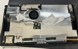 右にバッテリー、真ん中に冷却ファン、緑色の色の本体基板などが見えます。