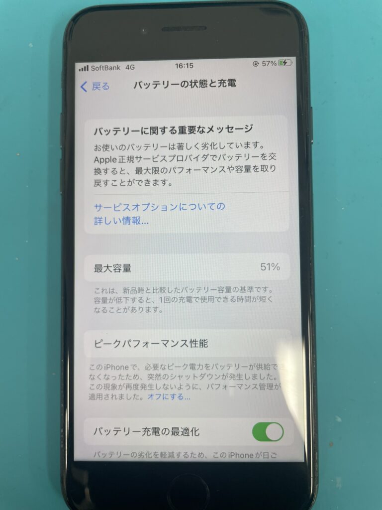 iPhoneはバッテリーの最大容量を確認できるので確認させていただいたところ51%になっていました。