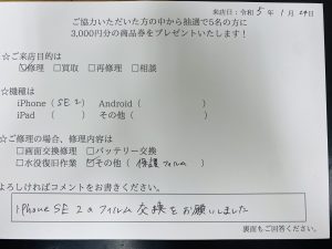 スマホスピタル横浜駅前 iPhoneSE2の保護フィルムを貼り直しました!