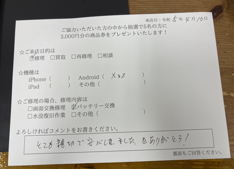 Xperia XZsバッテリー交換修理のご感想をいただきました。